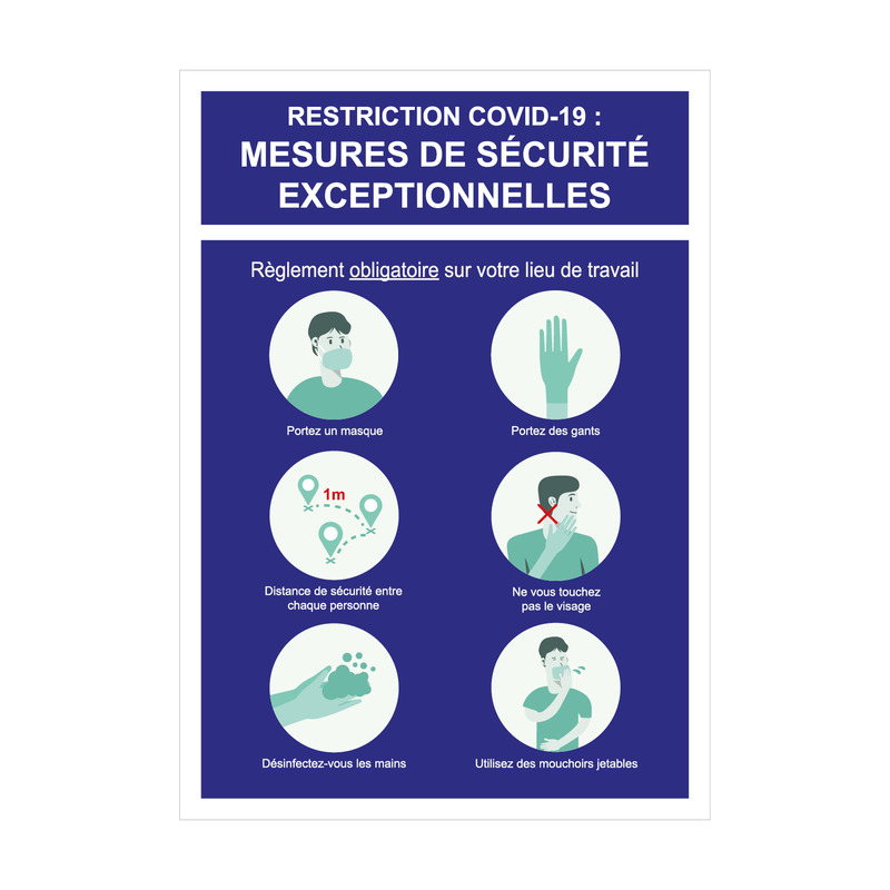 JMJCOM vous propose de la signalétique pour lutter contre le Covid 19. Équipez votre entreprise en signalétique. Ce visuel rappel les gestes barrières à adopter pour limiter le risque de contamination. Pour informer vos salariés ou vos clients.